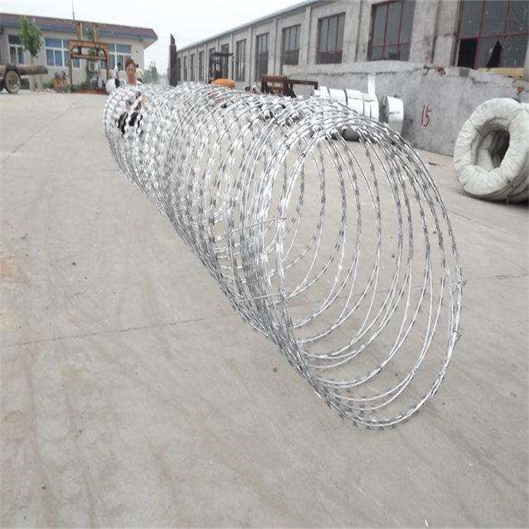 刀片刺繩規(guī)格型號為BTO-22,刀片厚度0.5±0.05,刀長22±1,刀寬15±1(單位:mm),直徑為80cm,材質為熱鍍鋅,上鋅量30g左右,刺繩拉開后間距在20cm左右。