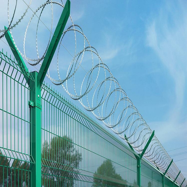 機場鋼筋網圍界浸塑:浸塑是將金屬構件預熱后浸入流化狀態(tài)的塑料粉末中,以金屬構件自身的熱量使粉末均勻沾附于 構件表面,再進一步加熱使粉末充分熔融流平,冷卻后金屬表面即形成平滑的塑層.塑層厚度0.8-1.2mm.浸塑防腐比較適用于潮濕,多雨的氣候.質量好的浸塑產品使用壽命可達10年.