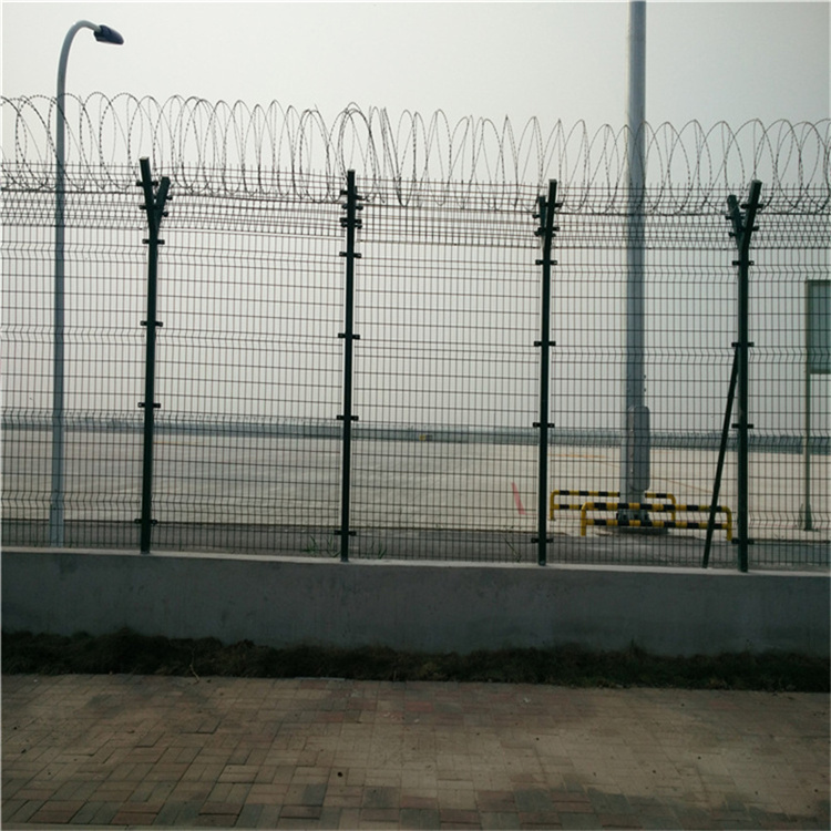 邊境Y型護欄網圍墻主要采用焊接網隔離柵,1、采用5.0mm高強度低碳鋼絲焊接。2、網孔:50mmX100mm,50mmX200mm。3、網片中帶有V型加強筋,可大大增強圍網的防沖擊力。4、立柱為60*60mm、80*80mm的矩形鋼,頂端焊有V型之架。5、表面處理:產品均為熱鍍鋅后采用高質量的聚酯粉末靜電噴涂,采用國際流行的RAL顏色,或低碳鋼絲粉末浸塑,塑層厚,防腐蝕力強。