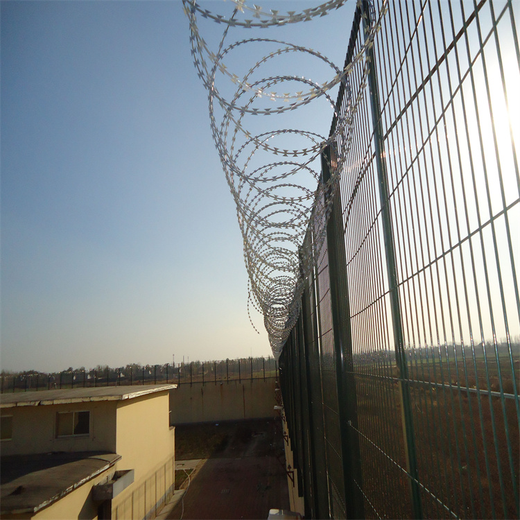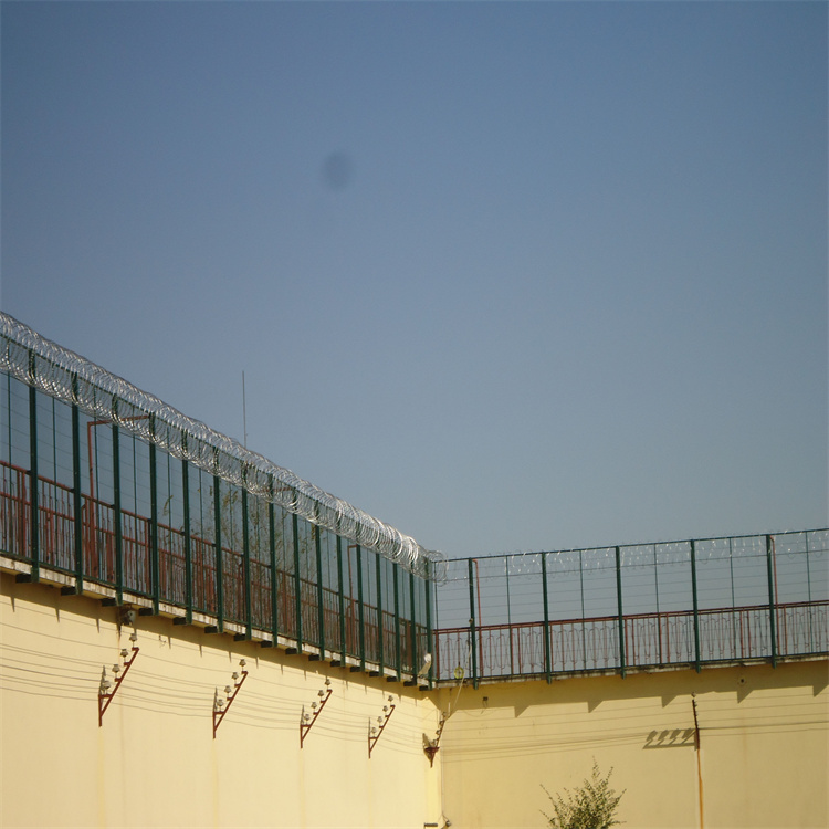 監獄鋼網墻由銳利尖角鍍鋅鋼板或不銹鋼薄板做刀片,高張力鋼絲做芯線組合而成的。鋒利的刀型刺由雙線扣裝后成蛇腹狀,既美觀又讓人不寒而粟。起到了很好的阻嚇作用