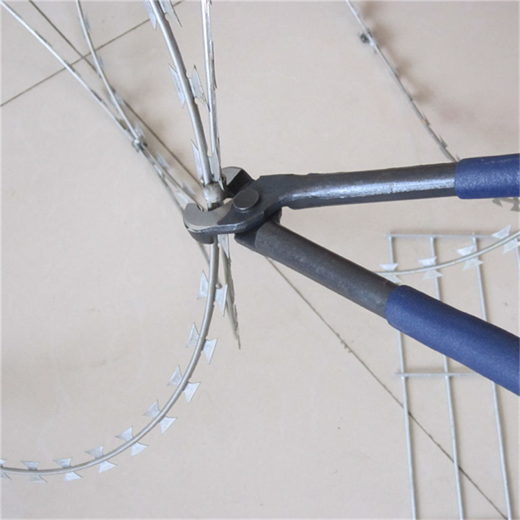 2 、安裝好立柱,把要安裝滾刀網的立柱上拉上鐵絲,拉上鐵絲,用鐵絲把刀刺網串接在一起然后在把鐵絲固定在安裝好的立柱上。