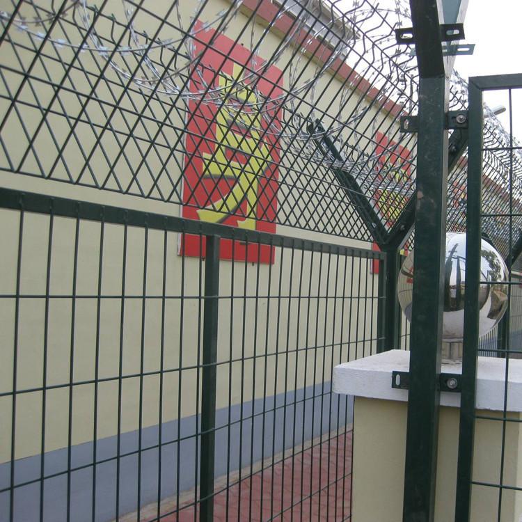 監獄獄墻防護網由低碳鋼絲焊接而成,高度上下兩端折彎增加強度采用鋼筋焊接,具有防攀爬,抗沖擊,高安全防護特性特性,有效防止人員,家畜進入。