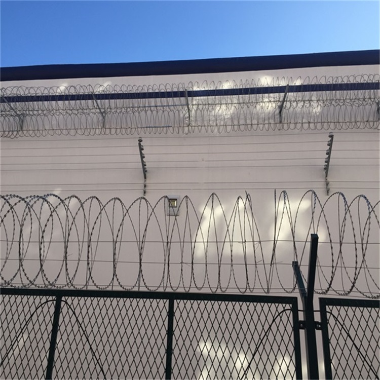 刀刺焊接隔離網一般由BTO-22型號的蛇腹型刀刺網,該產品一直以嚇阻效果好、防攀爬能力強、美觀、施工簡便、經濟實用等優異特點而被廣泛適用于監獄系統中。也因為這個特點,聰明的隔離網設計者將這款產品設計到了監獄隔離網中,憑借刀刺網的獨特性能這個設計一舉將監獄隔離網的防護等級提高很多。刀刺焊接隔離網目前是監獄、看守所、戒毒所等高戒備場所采用比較多的隔離網類型。