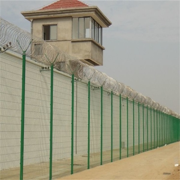 監(jiān)獄獄墻外圍隔離網(wǎng)材質(zhì)采用優(yōu)質(zhì)低碳鋼絲性價比高,網(wǎng)絲直徑4mm。網(wǎng)孔均勻分布,網(wǎng)孔為50*50mm。立柱采用60*60方形國際鋼管,管壁厚度3mm,高度為3400mm,立柱頂端應(yīng)進行防水密封處理。Y型柱的V型托長度600*600mm,采用20*30*1.2的方管。立柱間距2500mm,網(wǎng)片寬度根據(jù)實際可用空間合理調(diào)整。刀刺網(wǎng)刀片為不銹鋼板沖壓出的尖銳菱形刀片,芯線直徑2.5mm、刀片長21mm,刀寬15mm,厚度0.5mm。刀刺網(wǎng)直徑600mm。刀刺網(wǎng)排列額度10圈/M。每個卡扣之間的間距為200mm。立柱混凝土基座并預(yù)埋鋼結(jié)構(gòu)與立柱連接,基座采用地埋方式安裝,地埋濃度大于凍土層厚度,為500mm。柱與網(wǎng)框之間用防盜螺絲貫穿式連接。