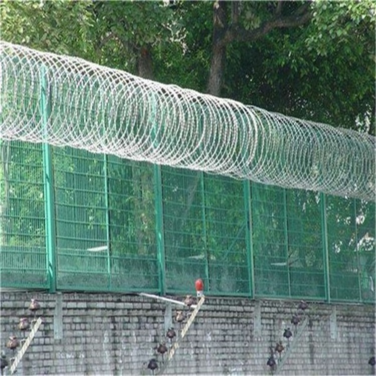 監獄刀片剌繩是由V型支架立柱,加強型焊接片網,安全防盜銜接件和熱鍍鋅刀片刺籠組成強度和安全防護性等級很高。在監獄護欄網頂部加裝刀片刺絲、刀片刺繩后又很好的增強了安全防護功能,可選用噴塑防腐辦法。
