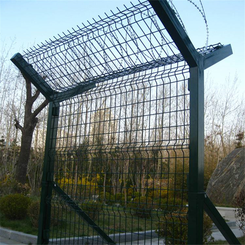 機場焊接防護隔離圍界:絲徑:4mm-6mm, 網(wǎng)孔:50*100mm 高度:1.8-3m 寬度:2-3m 頂部加防爬刺滾網(wǎng),另外一種焊接的防護隔離圍界是用刀片刺網(wǎng)直條焊接而成的,網(wǎng)孔一般為:75*150mm ,高度和寬度(同上),這種用刀片直條焊接的機場防護圍界,具有更好的防攀爬防隔離效果。