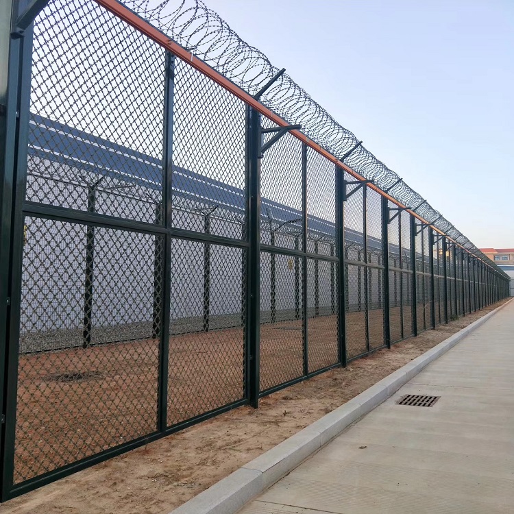 2、監獄鋼網隔離網、刀刺網設計要求整體連貫一致,框網方正,對角線誤差不大于2cm。隔離網安裝離地距離5-8cm,框網與立柱一般采用螺栓固定邊耳式連接,網片每邊與立柱連接點不少于六處。