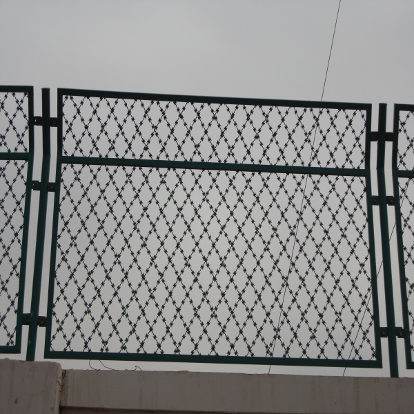 三:鋼絲焊接的網片采用鍍鋅絲焊接而成,框架表面采用pvc浸塑處理,與刀片刺網連接。