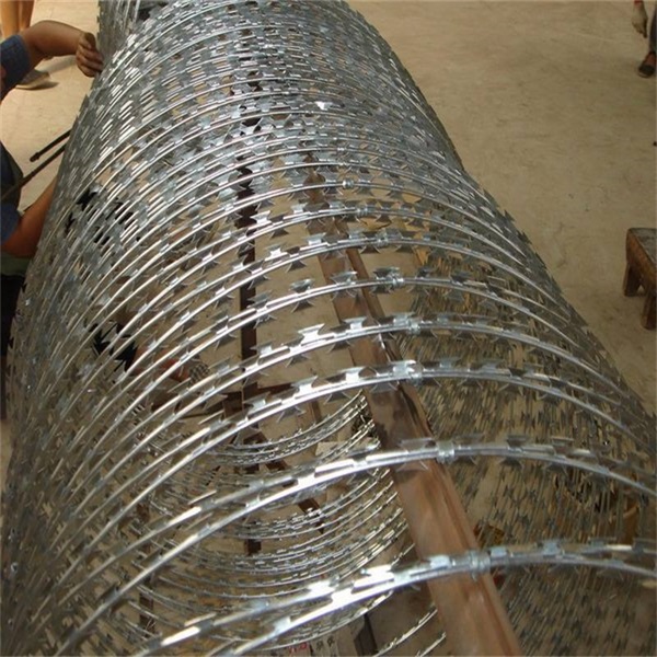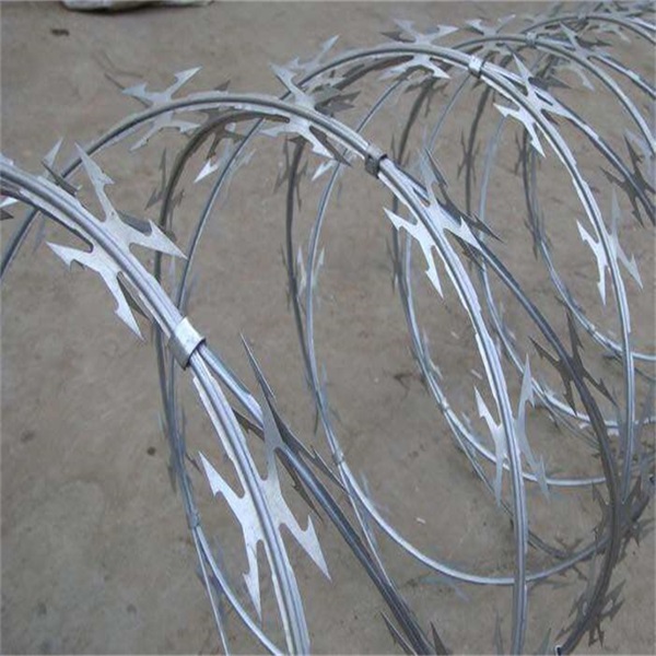 蛇腹型刀刺網(wǎng),由于各區(qū)域文化名稱差異也被叫做滾刀網(wǎng),蛇腹式刀刺網(wǎng)材料有中碳鋼絲、冷軋鍍鋅薄板,不銹鋼板,不銹鋼絲。蛇腹型刀片刺網(wǎng),上、下懸掛0.5米的交叉蛇腹型刀片刺網(wǎng),刀片刺網(wǎng)采用鋼板沖壓成型包附于鋼絲(筋絲)之上,由銳利尖角鋅鋼板或不銹鋼薄板做刀片,高張力鋼絲做芯線組合而成的。鋒利的刀型刺由雙線扣裝后成蛇腹狀既美觀又讓人不寒而粟。起到了很好的阻嚇作用。刀片刺網(wǎng)硬度好,制造及特點:鋼絲為芯絲,將沖壓好的刀片包裹在芯絲上,一次制成。產品具有超強的防護能力和恐嚇能力,安裝方便,壽命長。蛇腹型刀刺網(wǎng)的直徑常用的是500mm、600mm、800mm,其他規(guī)格均可定做,艾瑞廠家保證產品品質。