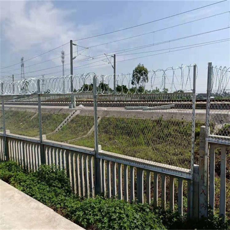 支架與防護(hù)柵欄采用支架抱箍銜接,關(guān)于曾經(jīng)裝置金屬網(wǎng)片的防護(hù)柵欄。刺絲滾籠直接采用Φ2.5mm的冷拔鍍鋅鋼絲或刺絲銜接卡扣固定于金屬網(wǎng)橫片和金屬絲上。刺絲滾籠由刺絲銜接卡扣與固定在支架上的縱向拉筋相銜接。縱向拉筋與支架的銜接采用Φ2.5mm的冷拔鍍鋅鋼絲繞2圈后擰緊固定。支架設(shè)置在跨度3m防護(hù)柵欄的立柱和跨中位置,其中跨度進(jìn)設(shè)置與立柱上部。