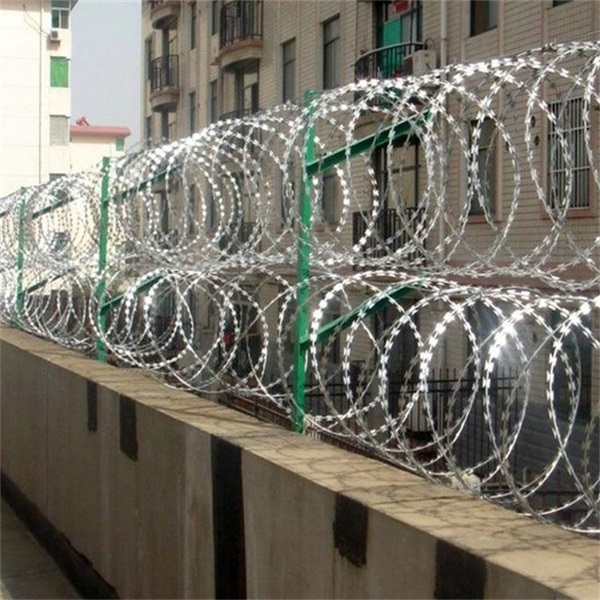 圍墻加高倒刺網(wǎng)工藝︰蛇腹形刀刺網(wǎng)由熱鍍鋅鋼板或不銹鋼薄板沖壓出尖銳的刀片狀,高張力鍍鋅鋼絲或不銹鋼絲做芯線組合而成的阻絕器材。由于刺網(wǎng)造形獨(dú)特不易觸摸,因而能達(dá)到極好的隔離防護(hù)效果。產(chǎn)品的主要材質(zhì)有鍍鋅板和不銹鋼板。圍墻加高倒刺網(wǎng)材質(zhì)型號(hào):可大致分為304不銹鋼刀刺網(wǎng)、201不銹鋼刀刺網(wǎng)、430不銹鐵刀刺網(wǎng)、熱鍍鋅刀刺網(wǎng)、冷鍍鋅刀刺網(wǎng)、噴塑刀刺網(wǎng)。
