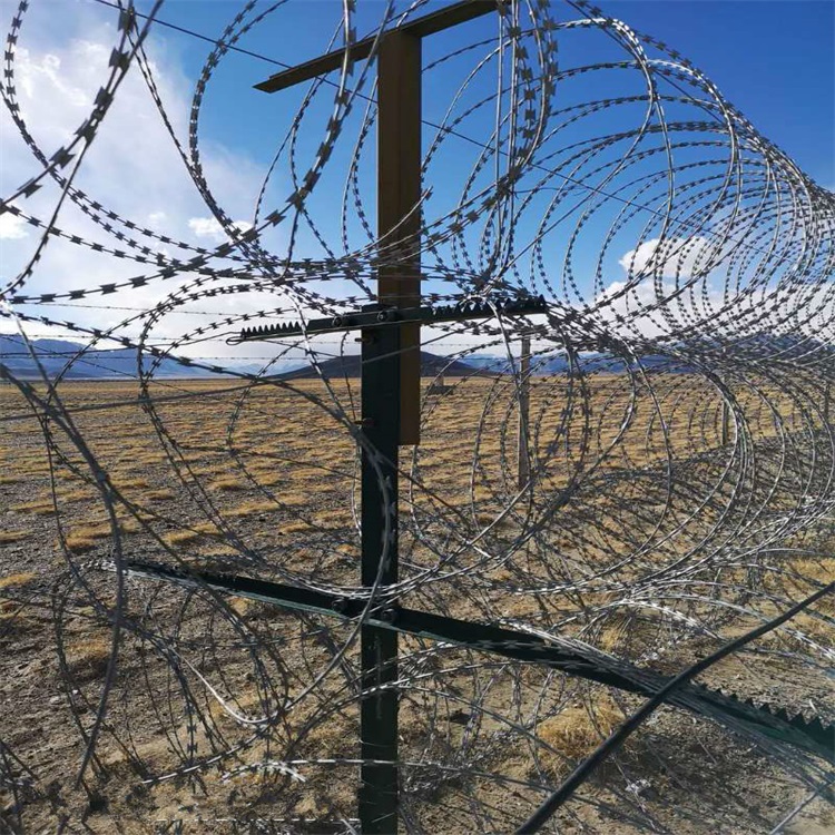 5、T字型邊境鐵絲網,"T”型網樁刺鐵絲按側部14道橫絲,2道斜拉絲,頂部5道橫絲的標準架設,側部刺鐵絲間距15厘米,底部刺鐵絲距離地面距離為5厘米,頂部刺鐵絲間距為20厘米,相鄰兩個立樁之間斜拉刺鐵絲與水平刺鐵絲交叉處用專用卡扣固定,方型鋼樁刺鐵絲側部按14道橫絲,2道斜拉絲,頂部3道橫絲的標準架設,側部部刺鐵絲間距為15厘米,底部刺鐵絲距離地面距離為5厘米,頂部刺鐵絲間距為12.4厘米,相鄰兩個立樁之間斜拉刺鐵絲與水平刺鐵絲交叉處用專用卡扣固定。