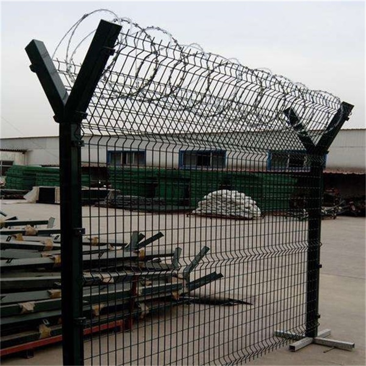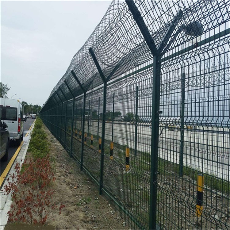 1、機場護欄網也被稱為機場護欄或Y型安全保護網,由V形支架立柱,加強焊接網片,安全防盜聯(lián)接件和熱浸鍍鋅刀片組成。