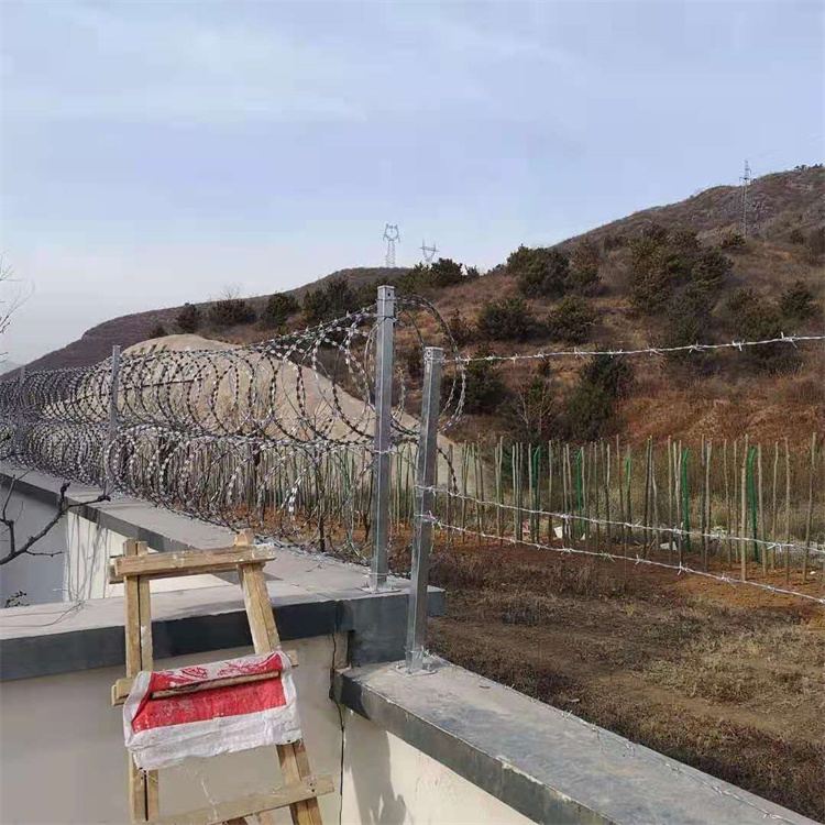 特 點:刀片刺網又名刮刀型刺絲,是一種發展起來的防護、隔離能力較強的新型防護網產品。鋒利的刀型刺由雙線扣裝后成蛇腹狀,既美觀又讓人不賽而榮。起到了很好的阻嚇作用。同時該產品具有美觀、防陰效果好、施工便利等優點。刀片刺繩一般用干監獄做防護用,因刀片鋒利不易觸摸,起到一定的嚇陰作用那個,刀片刺繩,用途比較廣泛,他可以用于居民的墻體防護,也可以用來地等,該刺繩防咨效果比普誦刺繩要好,價格也不高,所以刀片刺繩越來越應用廣范。刀片刺網又名刀片刺繩,是一種發展起來的防護、隔離能力較強的新型防護產品。
