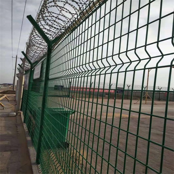 機場焊接鋼絲網(wǎng)圍界規(guī)格參考:絲徑:4mm-6mm, 網(wǎng)孔:50*100mm 高度:1.8-3m 寬度:2-3m 頂部加防爬刺滾網(wǎng),另外一種焊接的防護隔離圍界是用刀片刺網(wǎng)直條焊接而成的,網(wǎng)孔一般為:75*150mm ,高度和寬度(同上),這種用刀片直條焊接的機場防護圍界,具有更好的防攀爬防隔離效果。