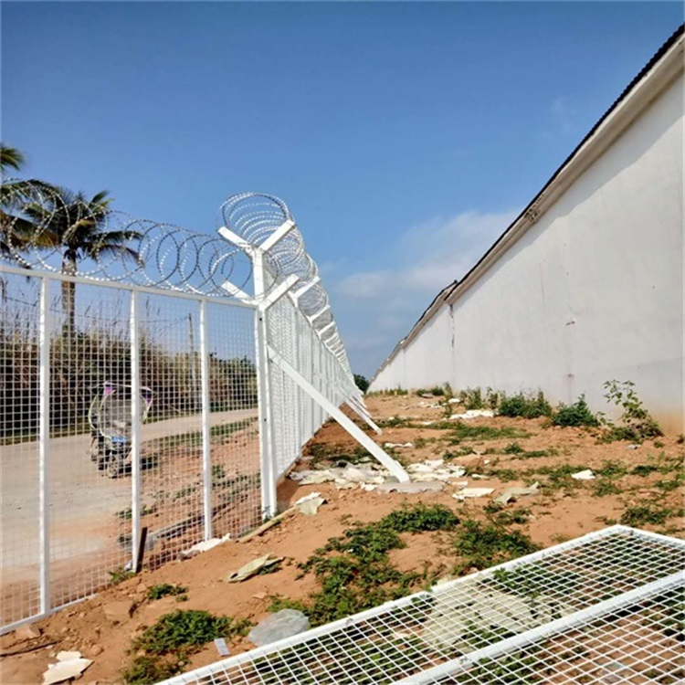 監獄圍墻隔離網上部裝置刀片刺網(刺絲滾籠),刀片刺網具有嚇阻、防翻越等效果,原料堅硬,高強度,高張力,造型規劃共同,不宜接觸,因而能到達非常好的防護阻隔效果。巡查道阻隔網還具有施工簡便,經濟實用等長處。
