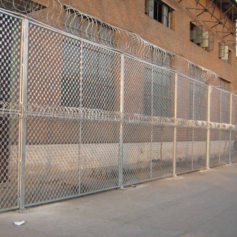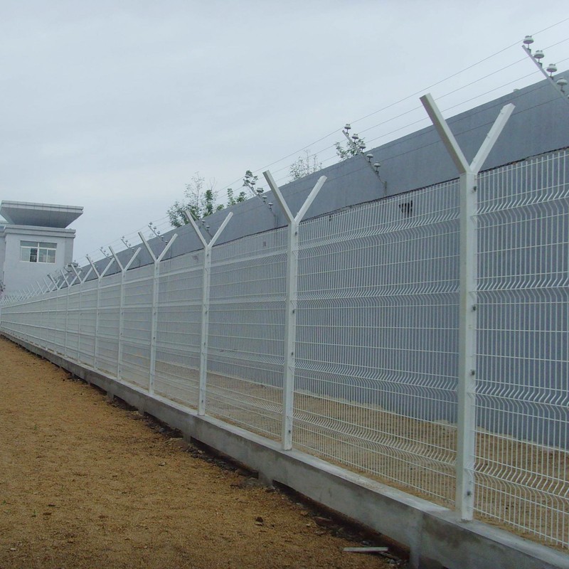 還有一些地方則采用刺繩圍欄,立柱和上面講的一樣,但是采用的是刺繩或者刀片刺網的形式。但一般用于監護部門。下面用圖片來表示更能一目了然。監獄護欄網用作圍墻增高網式,樣式一般上班要就刀刺滾籠,圍網也要求的比一般的要防攀爬,我帶大家看看各種樣式監獄護欄網的圍墻加高網。