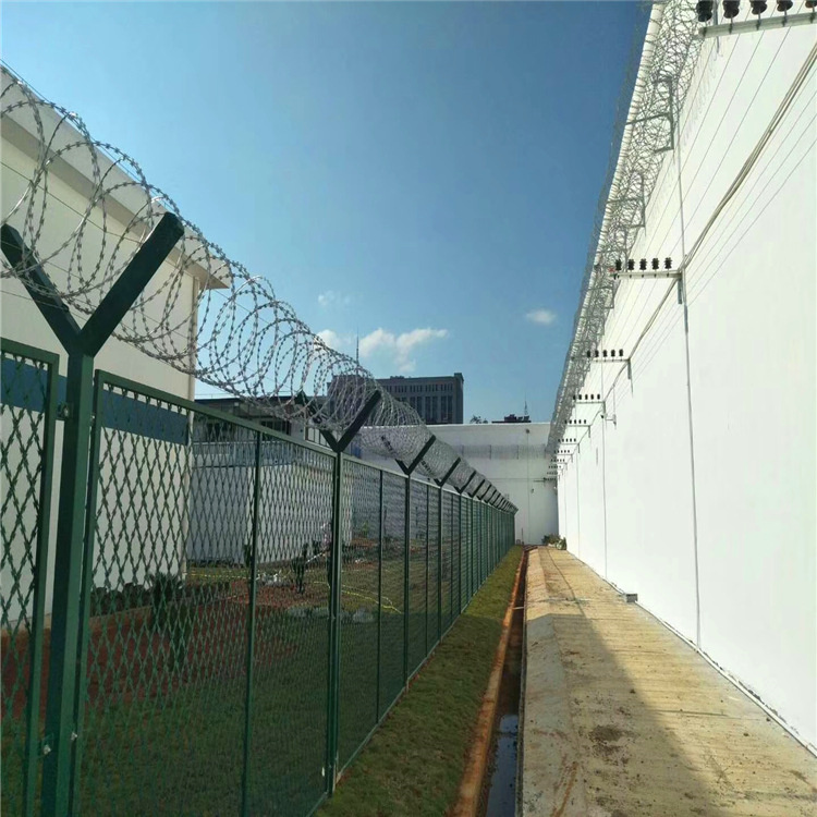 看守所戒毒所防護隔離網 武警中隊監墻防護網: 看守所 戒毒所防護隔離網 是非常重要的安全防護設施,由低碳鋼筋網片、Y立柱和蛇腹型刀...密、網面平整、網孔均勻、防攀爬、防拆卸、防剪、抗腐蝕性強等特點。顏色可根據各監獄的制作要求定制,常規顏色有草綠色、墨綠色、白色、灰色。 [ 查看詳情 ]
