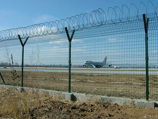 機(jī)場(chǎng)圍界網(wǎng)頂部加裝刀片刺絲、刀片刺網(wǎng)后又很好的增強(qiáng)了安全防護(hù)性能。其產(chǎn)品造型美觀、花色多樣,既起到圍欄作用,又起到美化作用。由于具有安全性高、防攀爬能力好,網(wǎng)片連接方式采用特制SBS緊扣件,有效防止人為的破壞性拆卸,橫向四道折彎加強(qiáng)筋,使網(wǎng)面強(qiáng)度顯著增加。