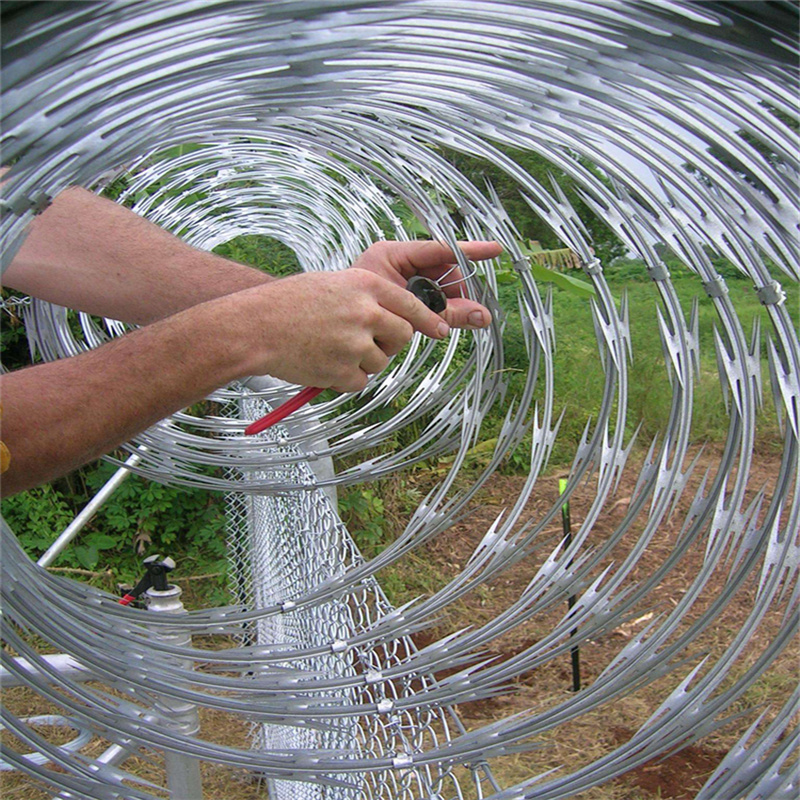 1、刀片滾籠采用刀片刺繩繞圈后相臨兩圈每隔120度用刺絲連接卡固定,張開后形成蛇腹狀閉合后刀剌繩圈徑為50cm,張開后每交叉圈安裝間距20cm,直徑不小于45cm。