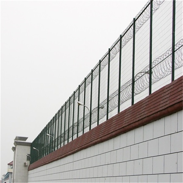 監獄圍墻加高網通常采用鋼絲直徑為5mm、6mm、6,5mm,網孔采用50mm*100mm、50mm*50mm、50mm*200mm、50mm*150mm, 組成結構:首先把網片焊接在鐵管框架上,框架是方管或者圓管焊接成的框架結構,在框架上焊接用于個立柱連接的連接板,用防盜螺栓與立柱連接。為了保證網片的防拆卸性能,網片連接方式采用特制防盜緊扣件,有效防止人為的破壞性拆卸。