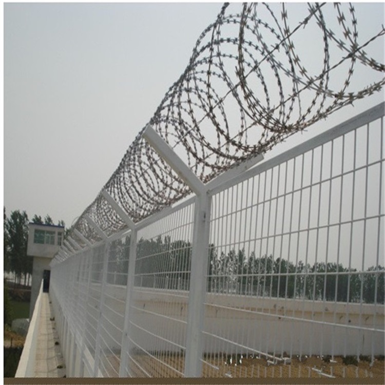 監獄防護網用料:網高:1800-3000毫米,網寬2000-3000毫米。邊框:200x300mmx2.0mm,絲徑500mm,孔徑500x2000mm/700mmx1500mm,立柱:50*50*2.0毫米或60*60*2.5毫米方管,焊接成Y型, pvc浸塑處理或熱鍍鋅。Y型架上邊架蛇腹型刀刺:由熱鍍鋅鋼板或不銹鋼薄板沖壓出尖利的刀片狀,高張力鍍鋅鋼絲或者不銹鋼絲做芯線組合而成的阻盡器材。刀刺直徑采取50-60厘米,刀型整潔、刀片鋒利、排列均勻致密、連接堅固、防腐才能強,可能達到防攀越、防拆卸等高保險等級。