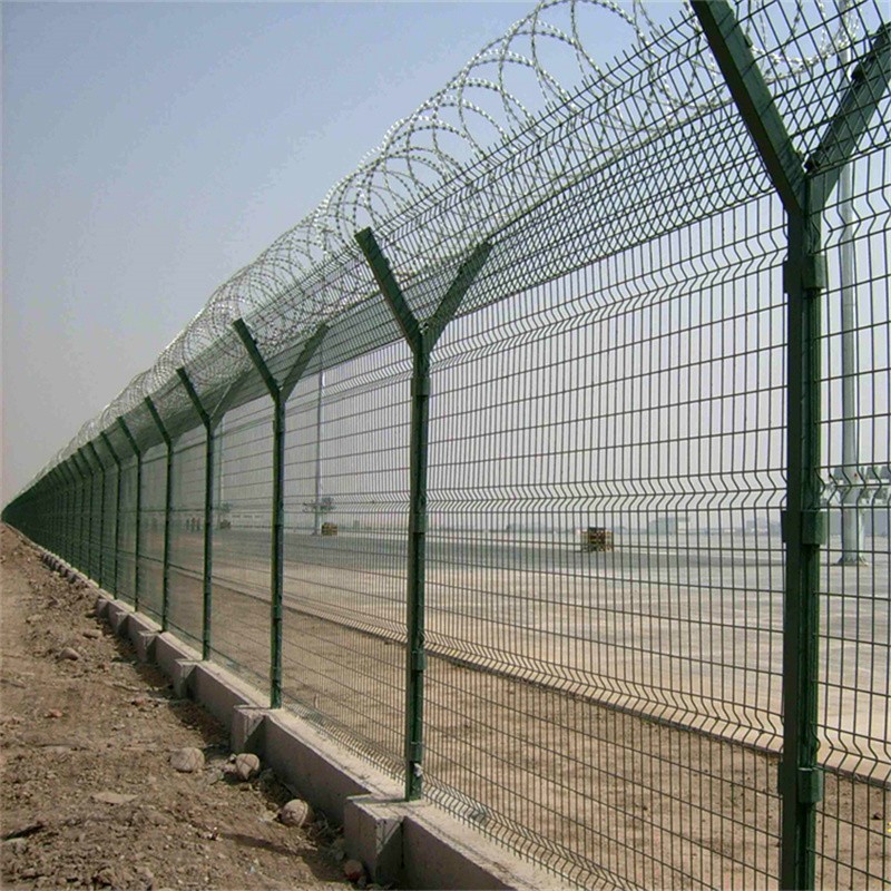 通用機場飛行區(qū)隔離圍界又被稱為刀片刺籠隔離網,立柱頂端呈Y字型,上面架設刀片刺繩,提高了隔離柵的防御等級。該產品的網面與三角折彎隔離柵的網面是相同的,經過折彎處理增加強度四周焊接50x50角鋼,并且減少單調乏味。為了避免攀爬發(fā)生,頂端加設刺絲滾籠,這樣會增加嚇阻作用,起到防范,并且在外型上形成獨有的特點,令人過目難忘。