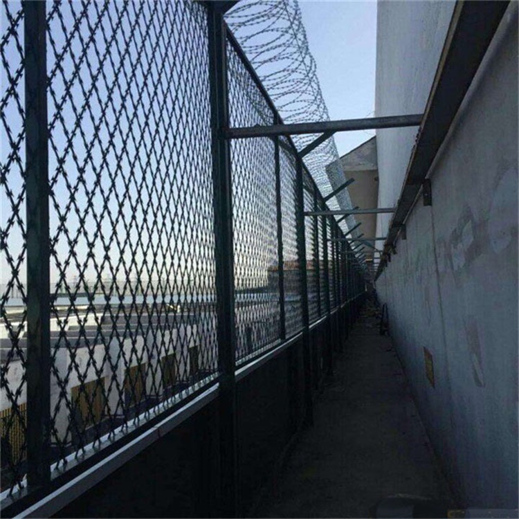 10、金屬網(wǎng)墻的頂部應(yīng)設(shè)一道蛇腹型刀刺網(wǎng),蛇腹型刀刺網(wǎng)材質(zhì)宜為304 不銹鋼,圈徑宜為 600mm,每米長度不應(yīng)少于 7 圈,圈距排列應(yīng)均勻,刀片形式宜為 BTO-22(芯線直徑 2.5mm±0.1mm,刀片厚 0.5mm±0.05mm,刀片長 22mm±1mm,刀片寬度 15mm±1mm,刀片間距 36mm±1mm),用于支撐刀刺網(wǎng)的支架伸出刀刺網(wǎng)長度不應(yīng)大于 50)mm;