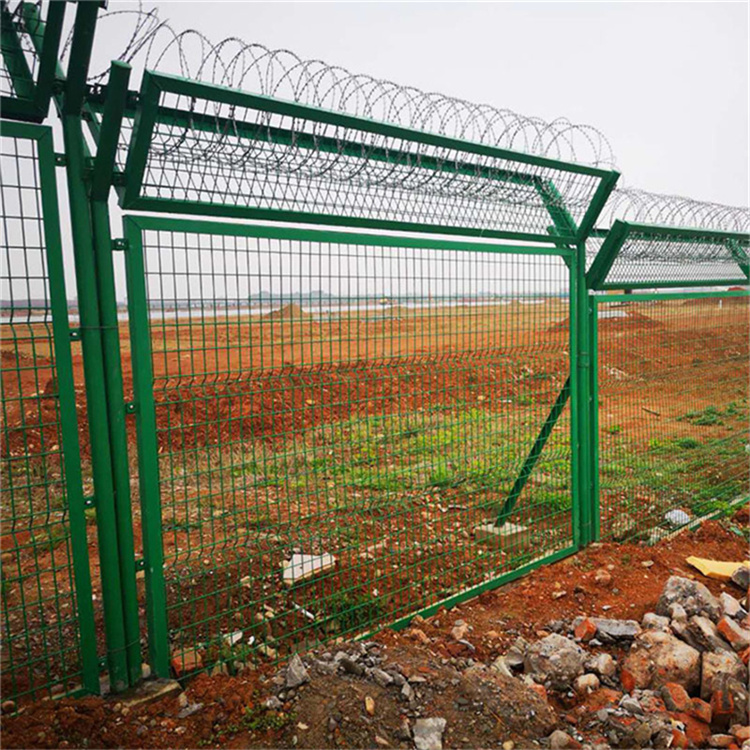 防攀爬設施:刺鋼絲可采用斧型刺刀圈,刺刀圈內芯為直徑2.5mm的冷拔低碳鋼絲并經防腐處理,表面熱鍍鋅;安裝刺刀圈與頂部 V 形延伸臂可用不銹鋼卡子連接,沿長度方向每隔500mm設4個卡子連接。