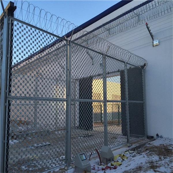 監獄鋼網墻主要是采用高強度的刀片刺網與普通防護網的結合,由V型支架立拄,加強型焊接片網,安全防盜連接件和刀片刺網組成.刀片刺網是一種新型防護網,由銳利尖角鍍鋅鋼板或不銹鋼薄板做刀片,鋼絲做芯線組合而成的.